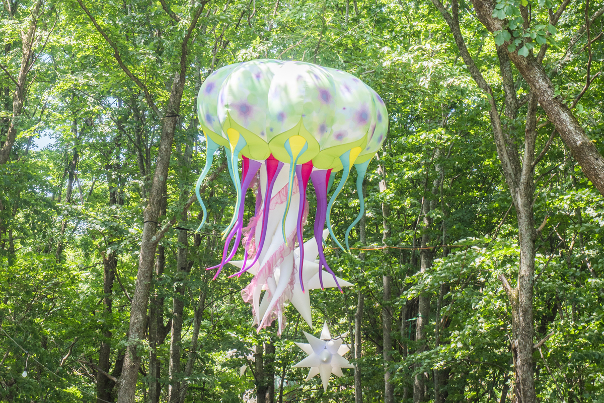 ステージとステージをつなぐ一本道は、太陽の光を受けキラキラと輝く木のトンネル。ところどころには魅力的なオブジェも。